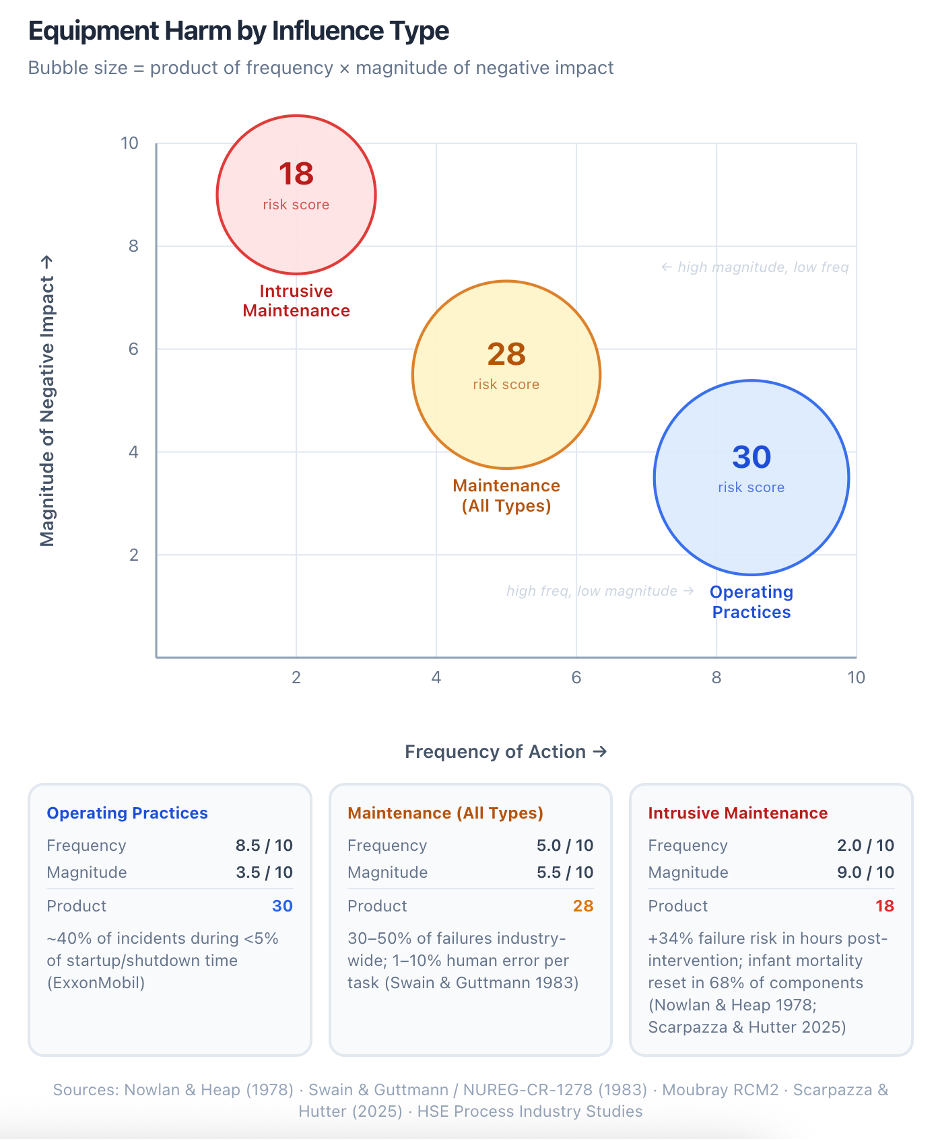 Industry literature commonly attributes 25 to 40 percent of equipment failures to operational causes. The direction is consistent: operations is a primary failure driver that most reliability programs treat as outside their scope.