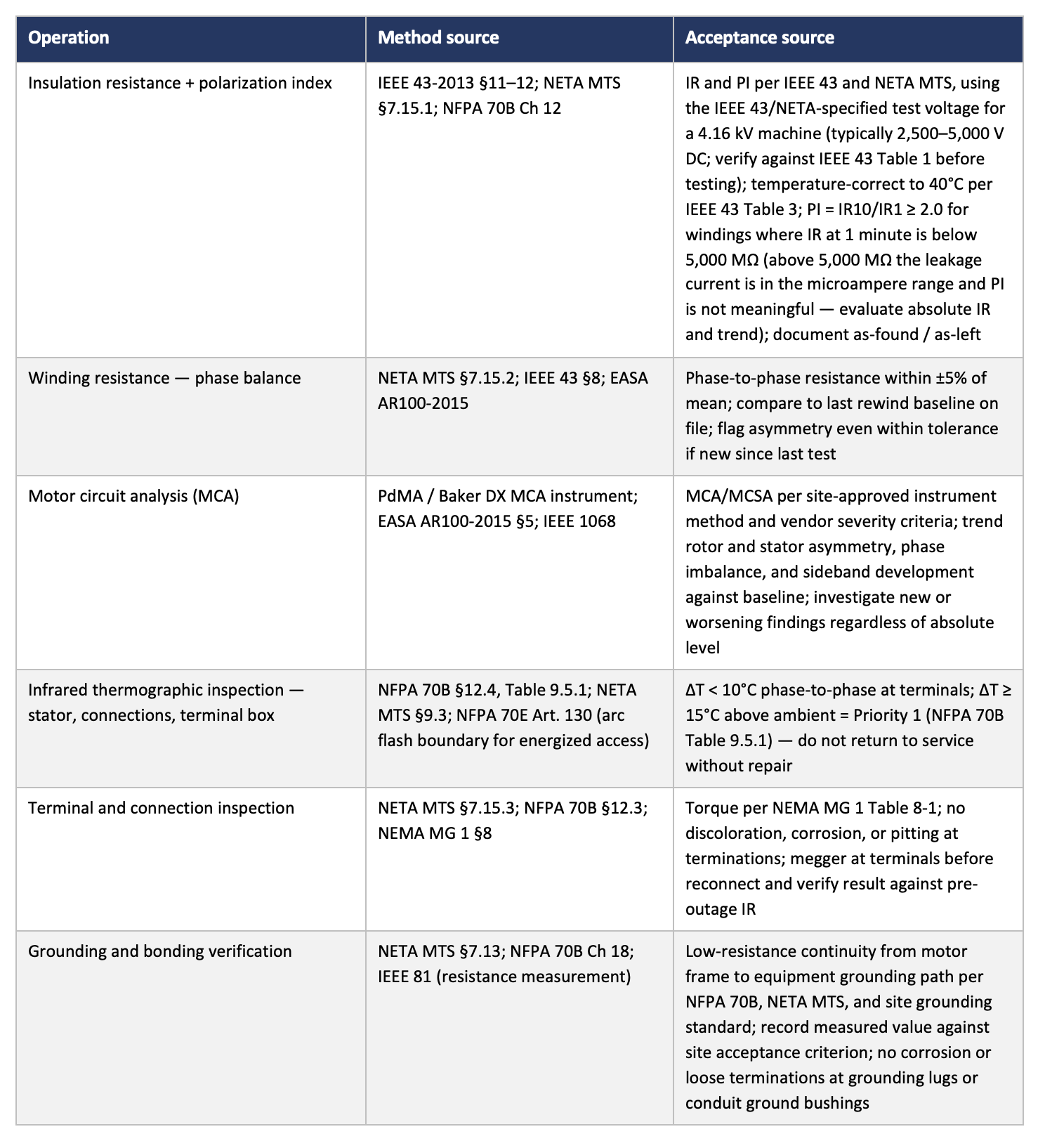 Electric motors fall under NFPA 70B Chapter 12 and IEEE 43: annual insulation resistance and thermography, with surge testing and power factor on critical machines at three-to-five-year cycles. The mechanical aspects of the motor follow the rotating equipment guidance above.