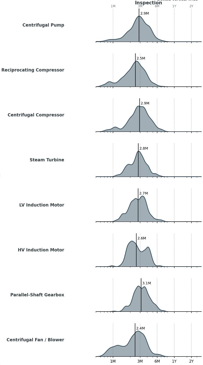 The technician and the “rules of thumb” recommend a quarterly visual as a baseline. I modeled the population-level distribution of recommended visual inspection task intervals indicated by FMEA P-F interval, and it output a median of 2.8 months, with a long left tail covered by operator rounds. This is the image at the top.
