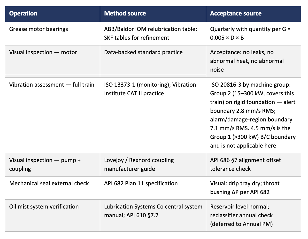 Quarterly PM — six operations after safety review and before completion verification — with every operation traceable to a published source.